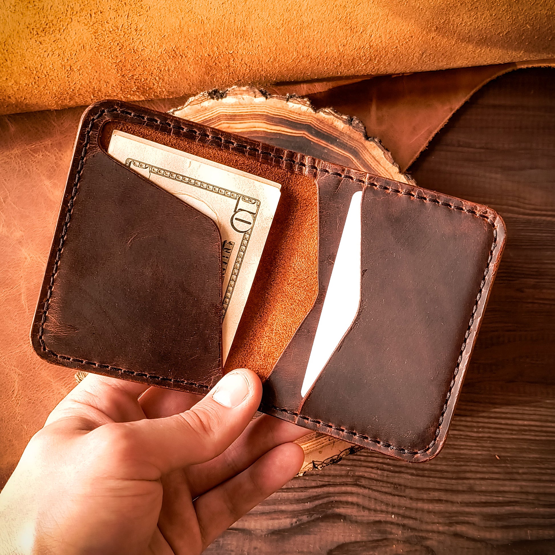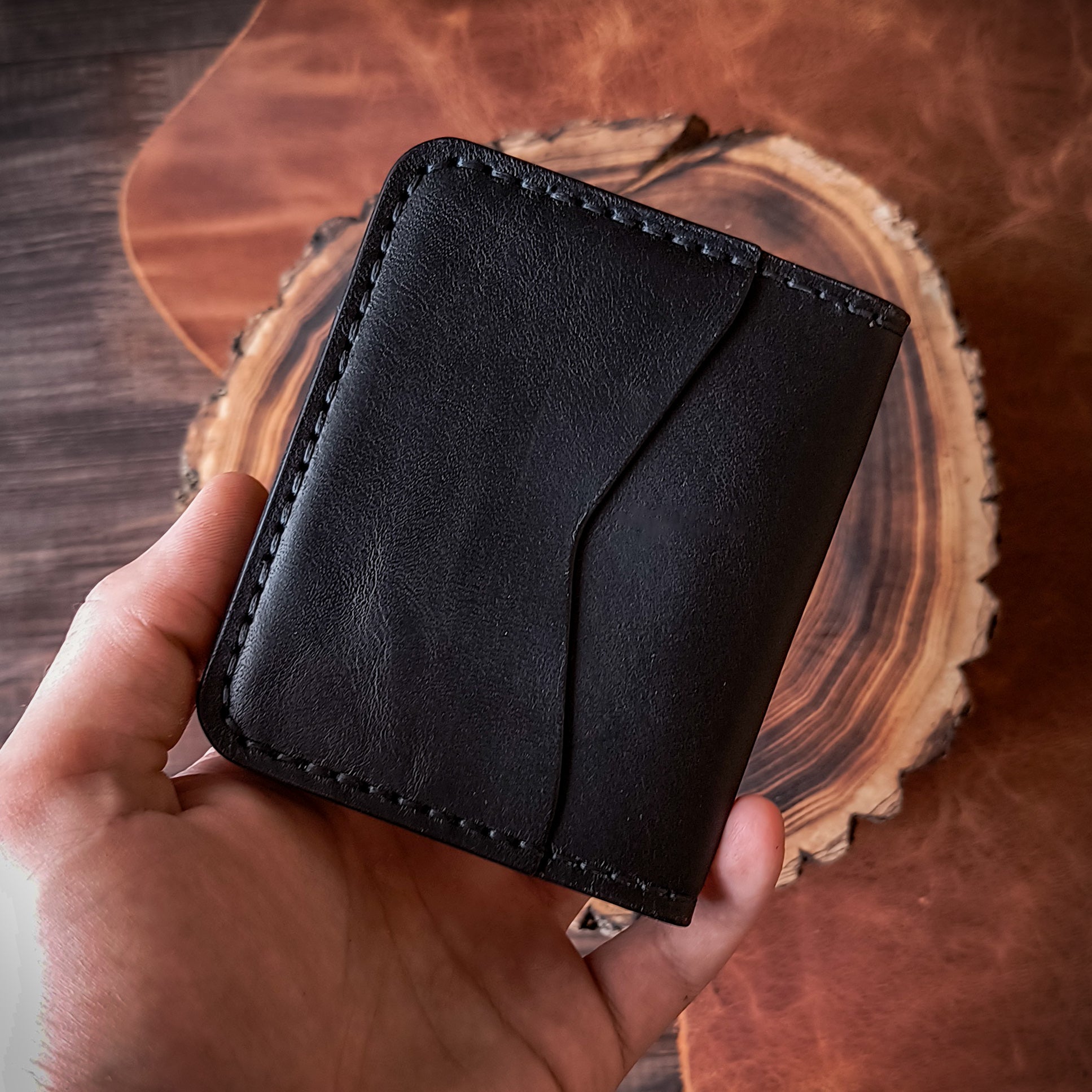 Bifold wallet on minimal design for some cards and cash slot. Front pocket carry friendly.
