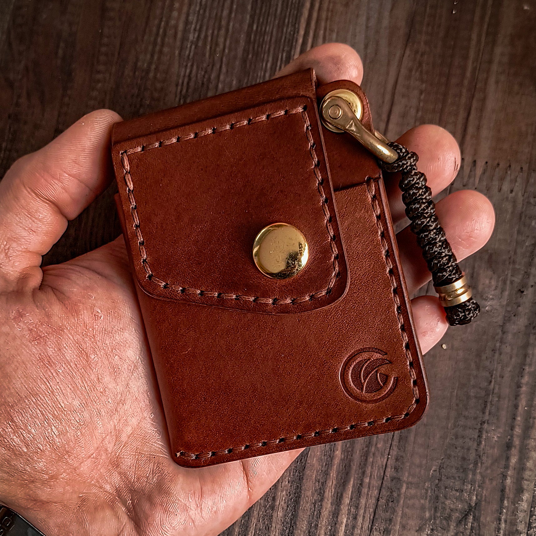 Handmade leather minimalist wallet — keep your cards and cash safe in one compact design. Built for front pocket carry, slim yet secure.